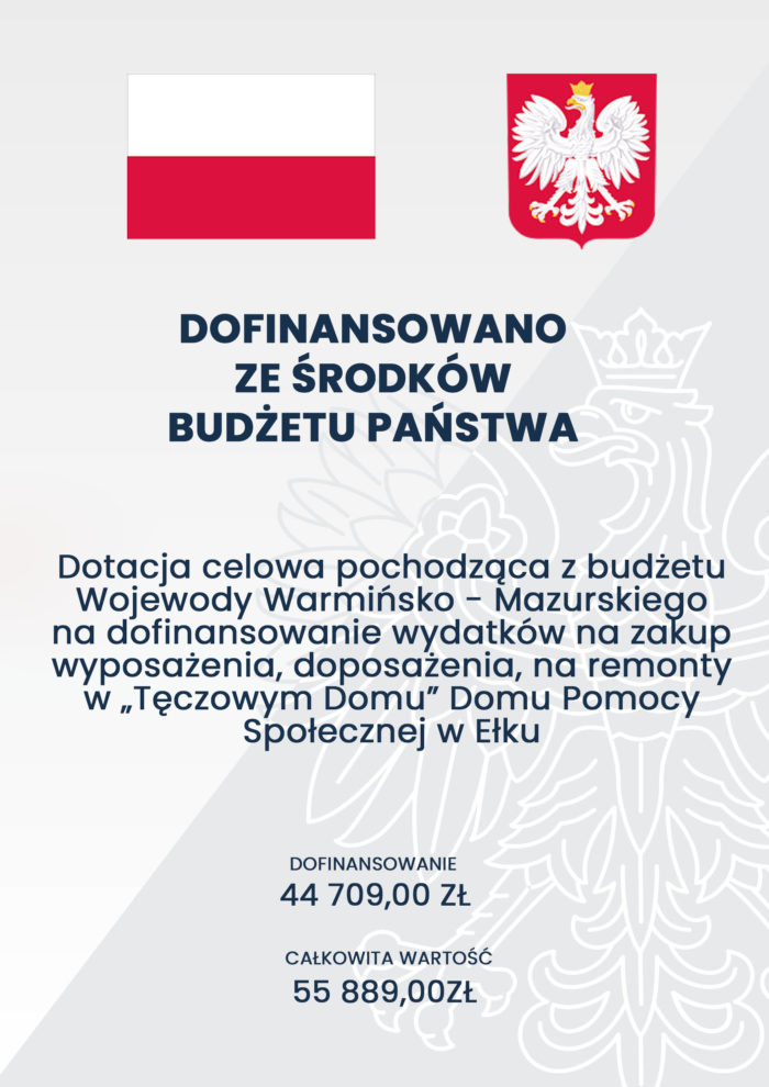 Dotacja celowa pochodząca z budżetu Wojewody Warmińsko – Mazurskiego na dofinansowanie wydatków na zakup wyposażenia, doposażenia, na remonty w „Tęczowym Domu” Domu Pomocy Społecznej w Ełku